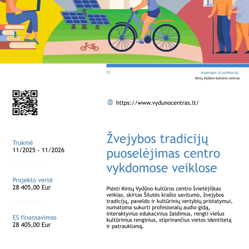 Kintų Vydūno kultūros centras 2025-11-26 pasirašė projekto Nr. 31SI1-25-05-K-003-PR001 „Žvejybos tradicijų puoselėjimas Kintų Vydūno Kultūros centro vykdomose veiklose“ vykdymo sutartį, kurio vertė 28 405,00 Eur. Trukmė-2025/11 - 2026/11 M.
